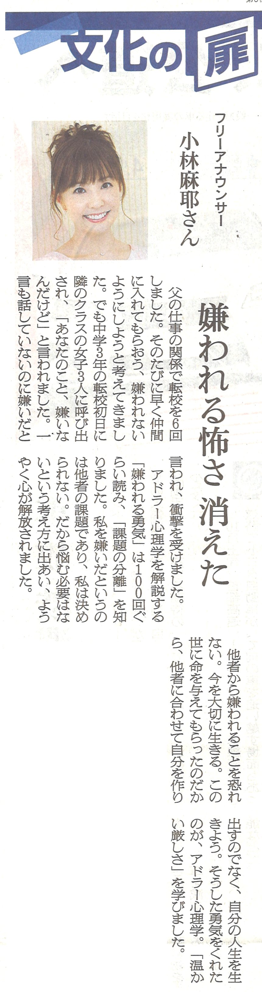 朝日新聞の11月29日の新聞に「はじめてのアドラー心理学」という特集が組まれていました。