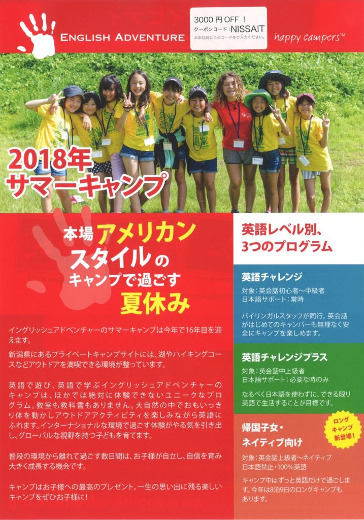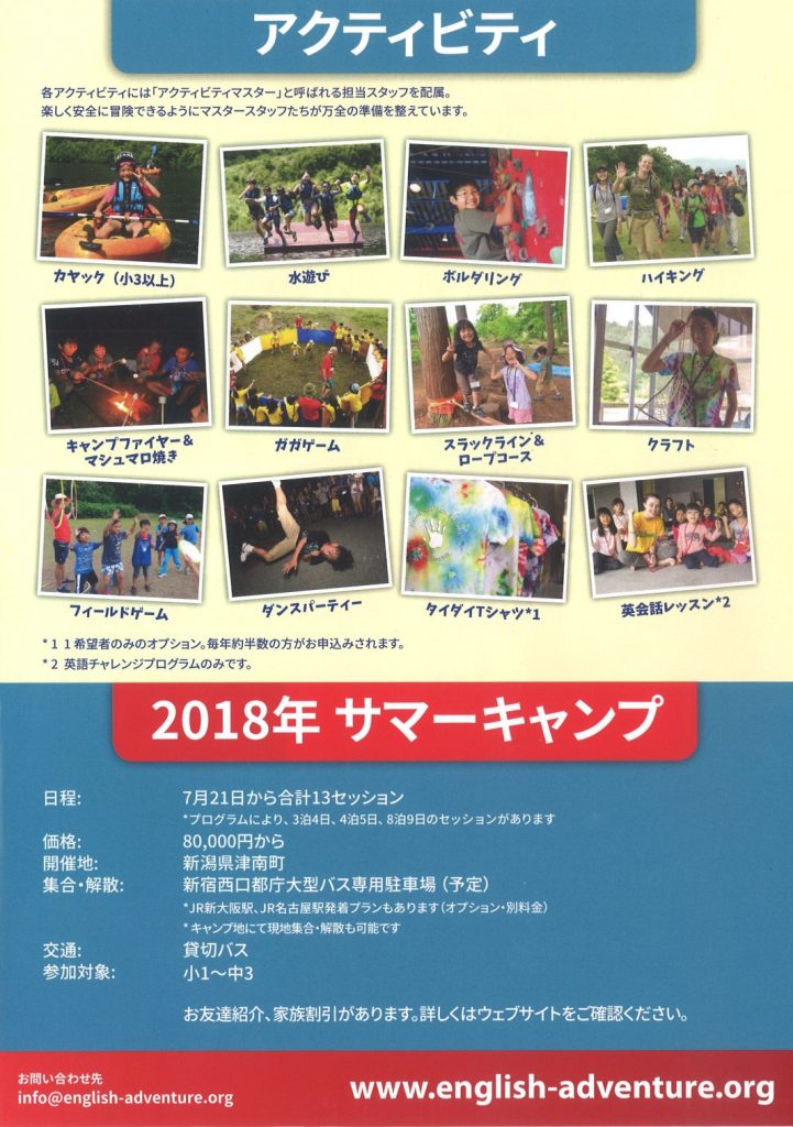 毎年大人気のプログラム、イングリッシュアドベンチャー主催のアメリカンスタイルのサマーキャンプ申込受付が始まりました。