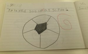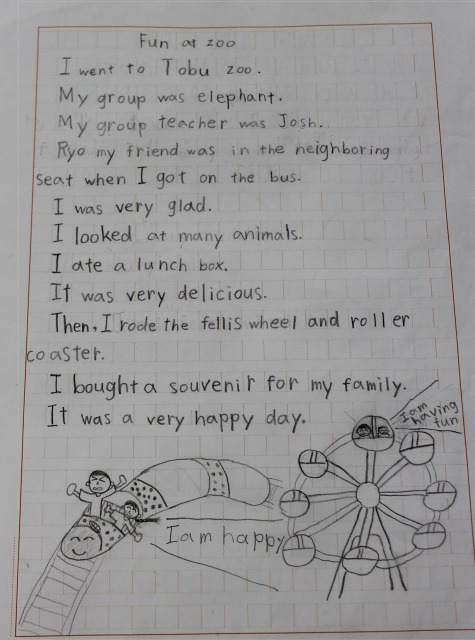 といっても、まだ小学生2、3年生は英文が書けませんから、絵日記なのです。クラスが始まるとその絵日記をみんなに披露します。アメリカの小学校でもよく行われているShow & Tell です。絵を見せながら、その時のことを英語で伝えます。先生やクラスメートもそのことでいろいろ聞いてきます。