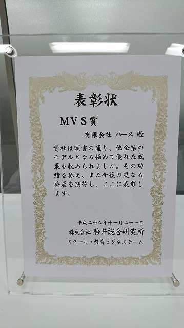 その研究会の中では、今年1年間で、スクール運営の様々な取り組みにおいてもっとも優秀だと船井総研が診断したスクールに表彰が行われました。ニッセイト英語専門教室(法人名:有限会社ハース)は、他の英会話スクールなその他のビジネス・スクールのモデル校となる優れた成績を収めたと、MVS賞(Most Valuable School) を受賞しました。
