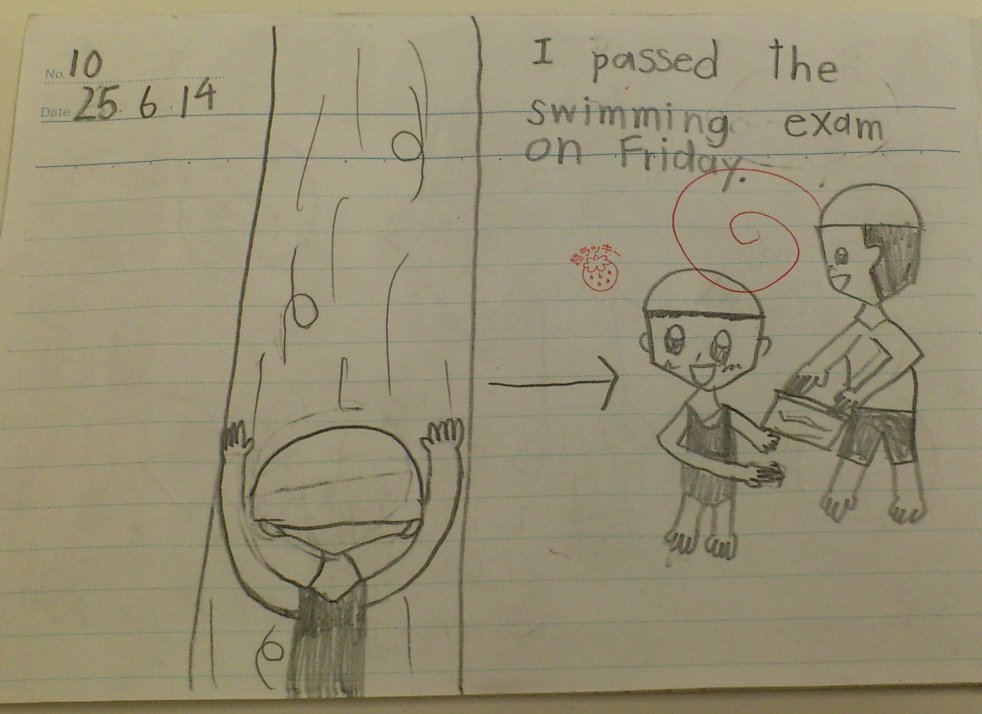 ニッセイト英語専門教室では、小学校2、3年生から絵日記が宿題に出されます。授業が始まるとその絵を見ながら先生とお話をします。
