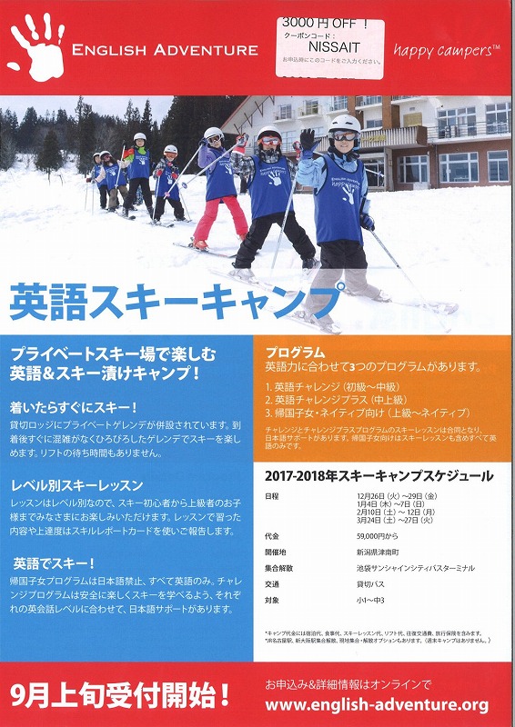 English Adventure (イングリッシュ・アドベンチャー)は、毎年、夏にはサマーキャンプ、そして冬と春にはスキーキャンプを実施しています。どれもアメリカンスタイルの英語漬けキャンプです。学習者の英語のレベルに合わせて3つのコースがあります。3泊4日です。この冬のスキーキャンプの募集要項を開示しました。毎年、ニッセイト英語専門教室、またオンライン英会話【Sレッスン】の生徒さんもたくさん参加されています。