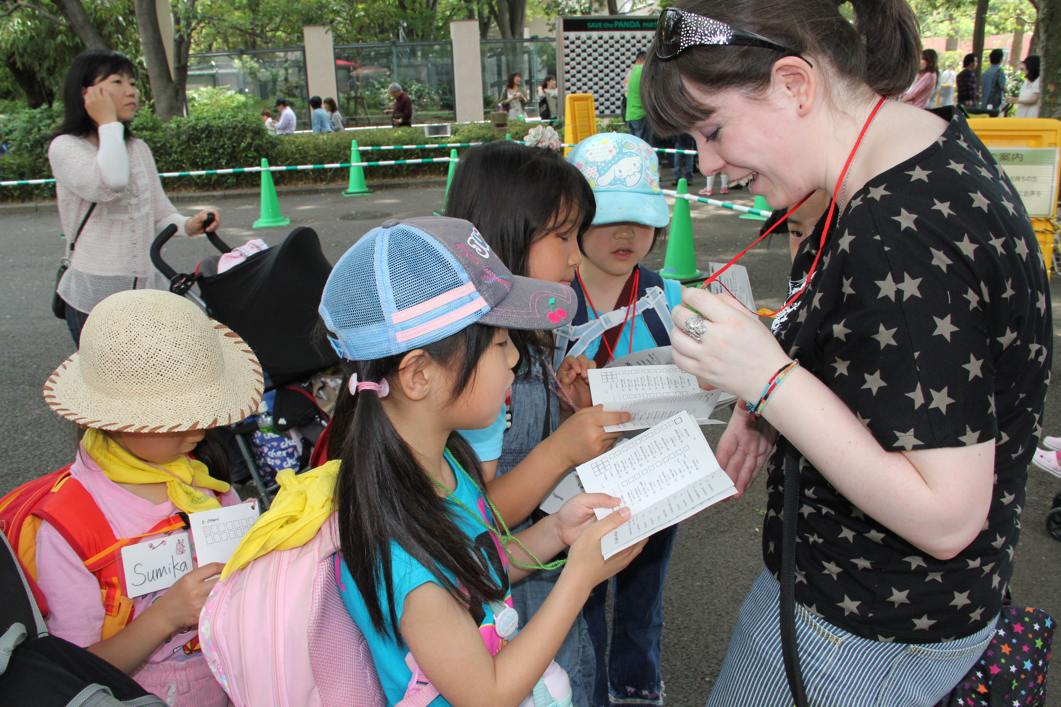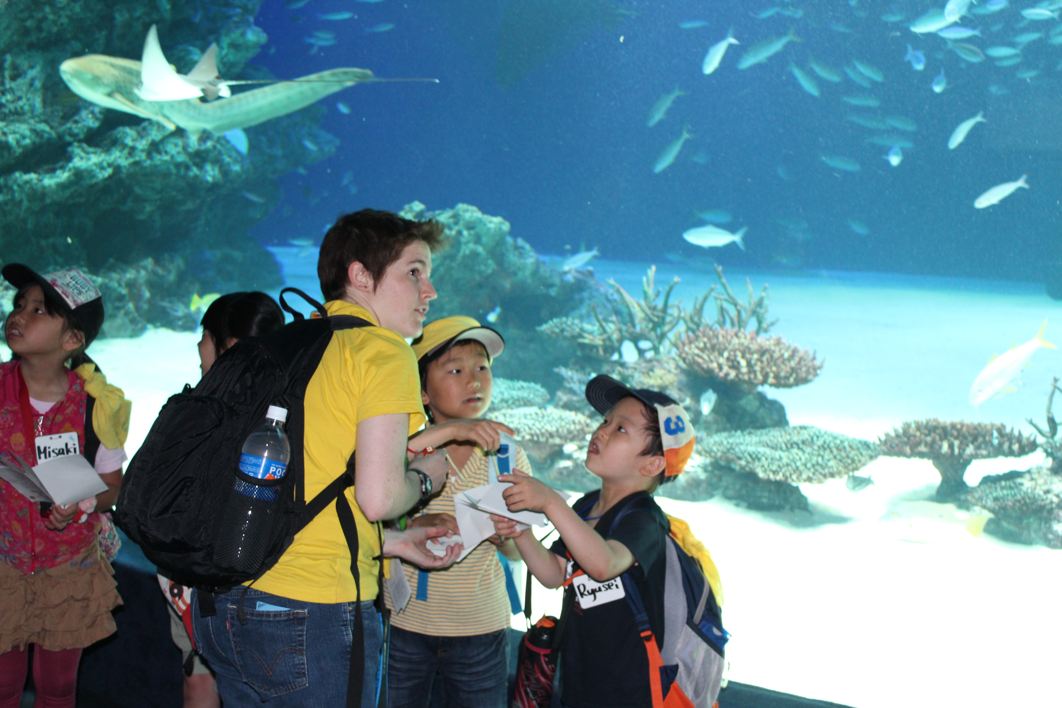 各グループを6名~8名にネイティブ講師と日本人コーディネーターが引率します。園中では、『Find and Say』といって、小冊子に載っている水族館の生き物を見つけて、先生に英語で言うとスタンプがもらえるゲームカードがあります。ある戸数以上のスタンプをゲットするとステキな景品がもらえます。