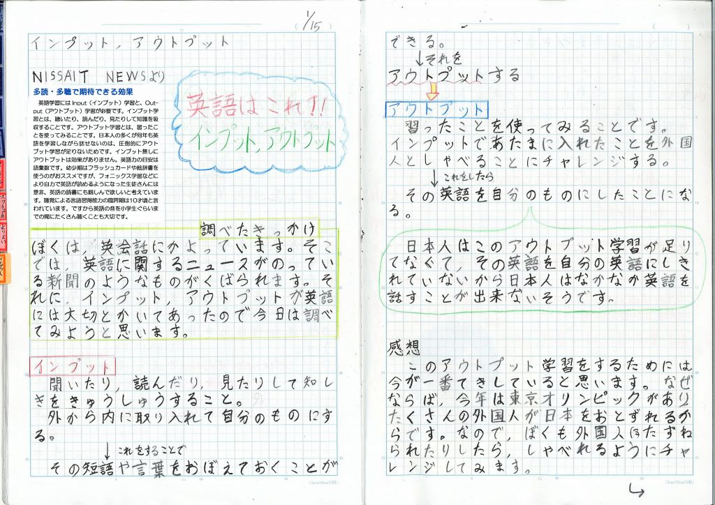 と思ったそうです。そして、自分でも「インプット」「アウトプット」という言葉をインターネットで調べ、自主学習用のノートにまとめ、学校に提出したそうです。そのノートが、こちらです。