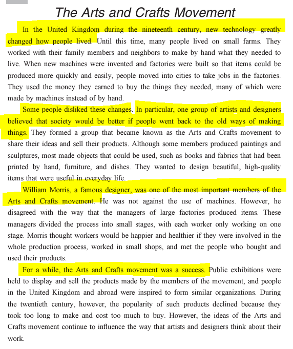2段落目:Some people disliked these chenges. In particular, one group of artists and designers believed that society would bebetter if people went back to the old ways of making things.