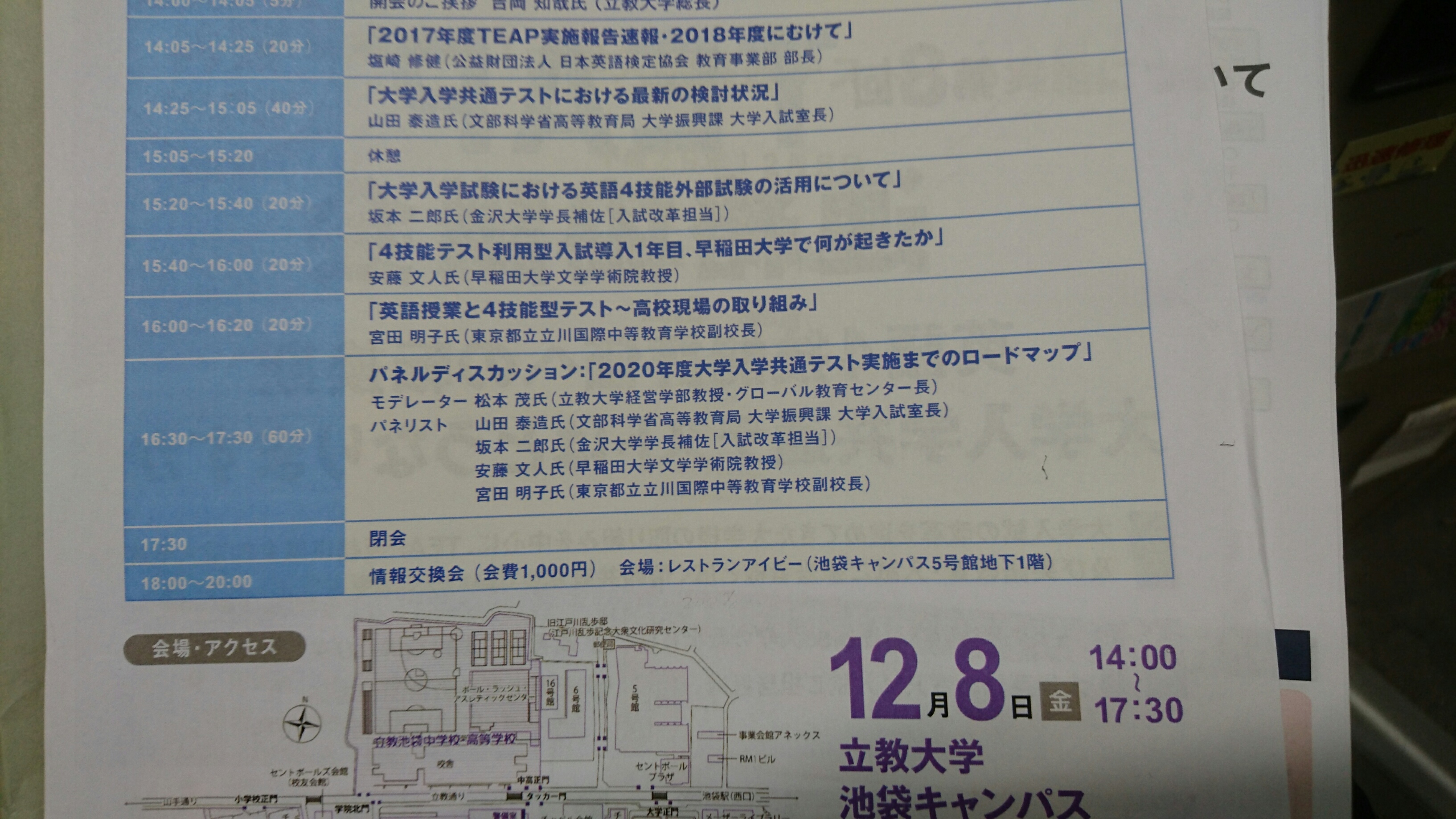 講演者は文部科学省の高等教育局大学振興課大学入試室長の山田泰造氏、国立大学を代表して金沢大学学長補佐の坂本二郎氏、私立大学を代表して早稲田大学文学学術院教授の安藤文人氏、そして公立の高校を代表して、東京都立立川国際中等教育学校副校長の宮田明子氏により講演、そしてパネルディスカッションがありました。